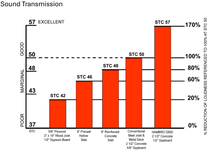 Hambro has an STC rating of 57 with bare concrete and no additives such as Batt Insulation. The Hambro assembly has an Impact Insulation Class (IIC) rating of 30 on bare concrete, similar to a solid 6 inch slab. Impact sound originates when one body strikes another, such as in the case of footsteps, hammering and objects falling. The IIC of any assembly is strongly dependent on the floor finishes and underlayment. Hambro’s IIC with pad and carpeting increases to 69. For LVT, tile, and hardwood flooring, you can achieve code with the introduction of an acoustical underlayment. Many flooring manufacturers will provide underlayment to uphold the warranty of their flooring product
